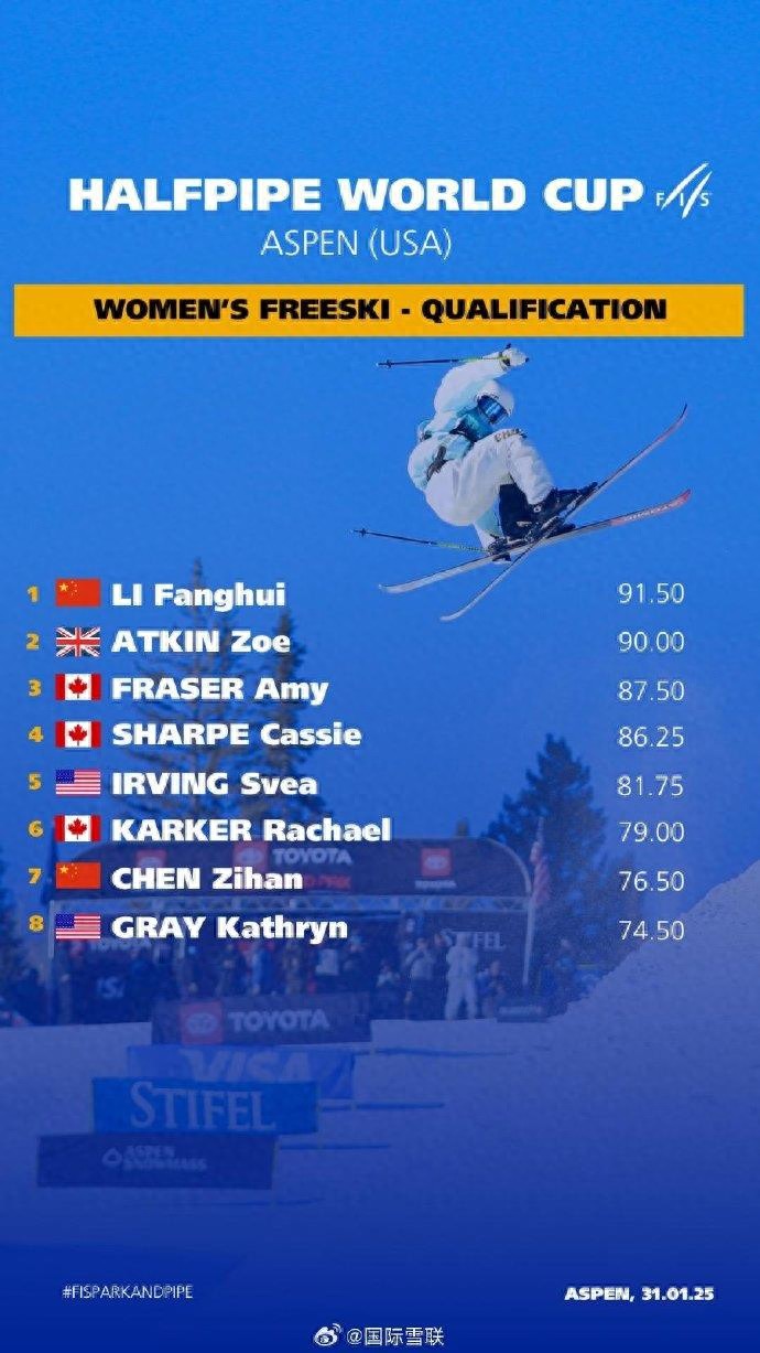 自由式滑雪U型场地世界杯阿斯本站资格赛女子组比赛时间(北京时间)为2月1日凌晨。谷爱凌因伤缺席本站比赛,陈紫菡和李方慧携手晋级决赛。