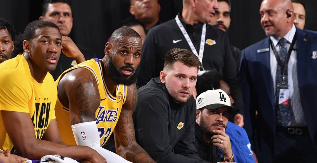 湖人对阵快船的比赛中,东契奇(左三)与詹姆斯坐在一起。图据NBA中国官网