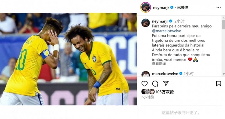 巴西传奇边卫马塞洛退役,内马尔社媒发文致敬。