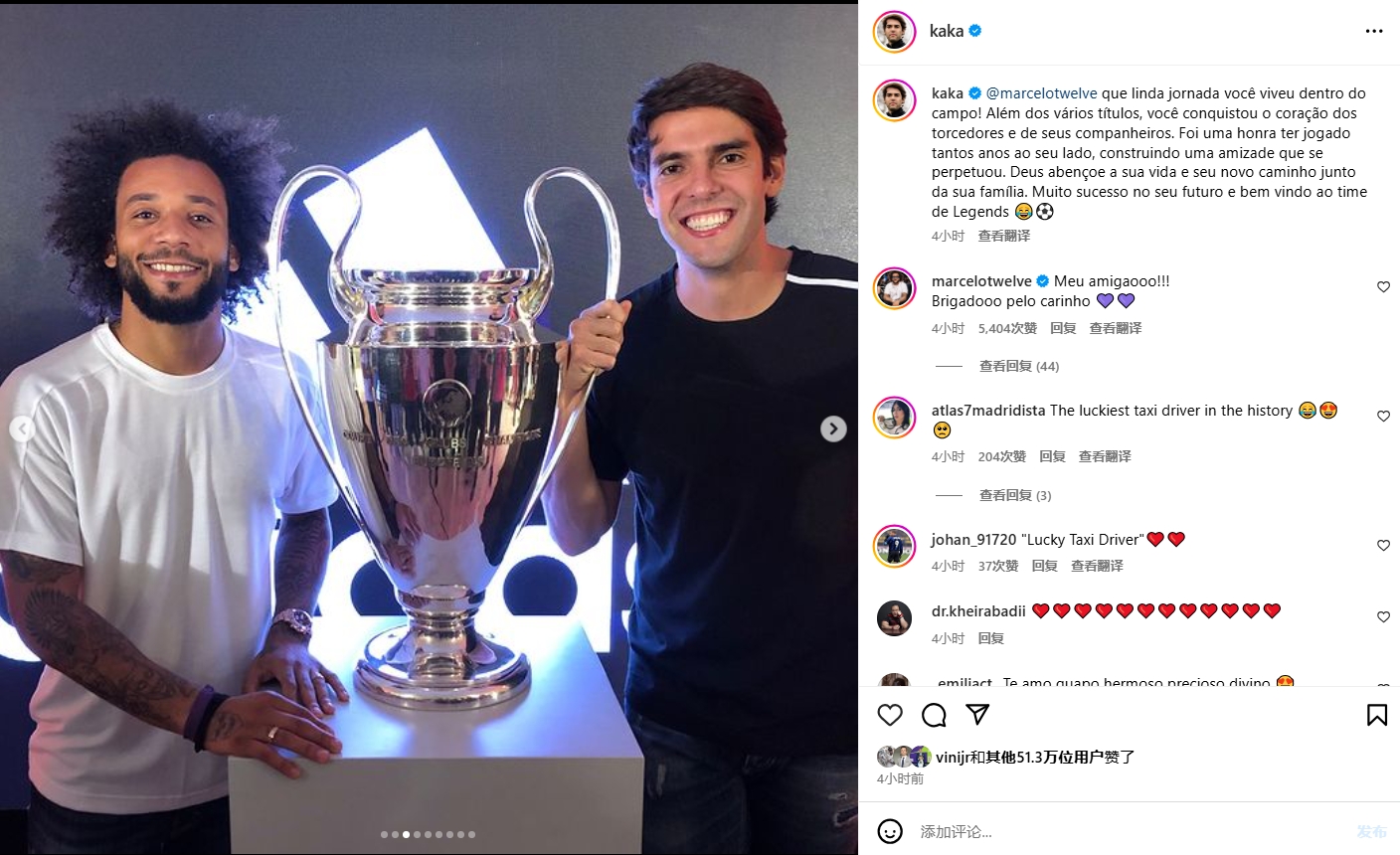 卡卡社媒晒出与马塞洛的合照,并写道:“马塞洛,你在球场上的旅程多么美好!除了许多冠军,你还赢得了球迷和队友的心。”