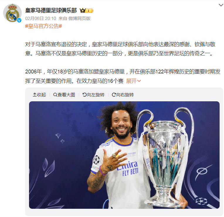 对于马塞洛宣布退役的决定,皇家马德里足球俱乐部向他表达最深的感谢、钦佩与敬意。马塞洛不仅是皇家马德里历史的一部分,更是俱乐部乃至世界足坛的传奇之一。