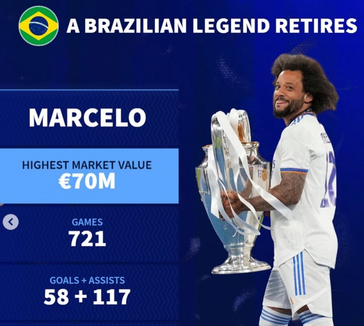 皇马传奇左后卫马塞洛官宣退役,《转会市场》也列出了马塞洛的生涯成就。