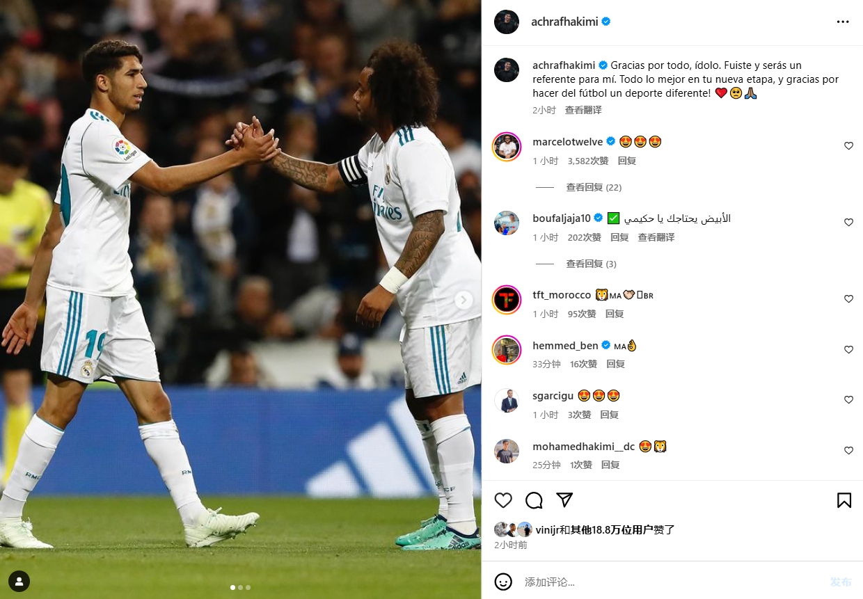 马塞洛官宣退役,曾在皇马和他共事过的右后卫阿什拉夫通过社媒送上祝福。