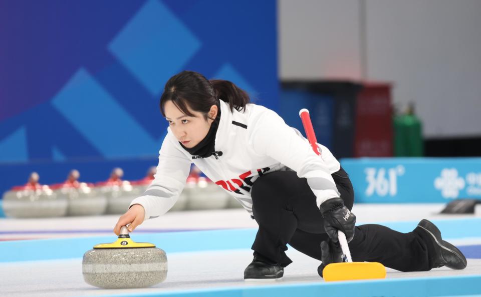 2月7日,韩国队选手金敬爱在比赛中掷壶。新华社记者 吕帅 摄