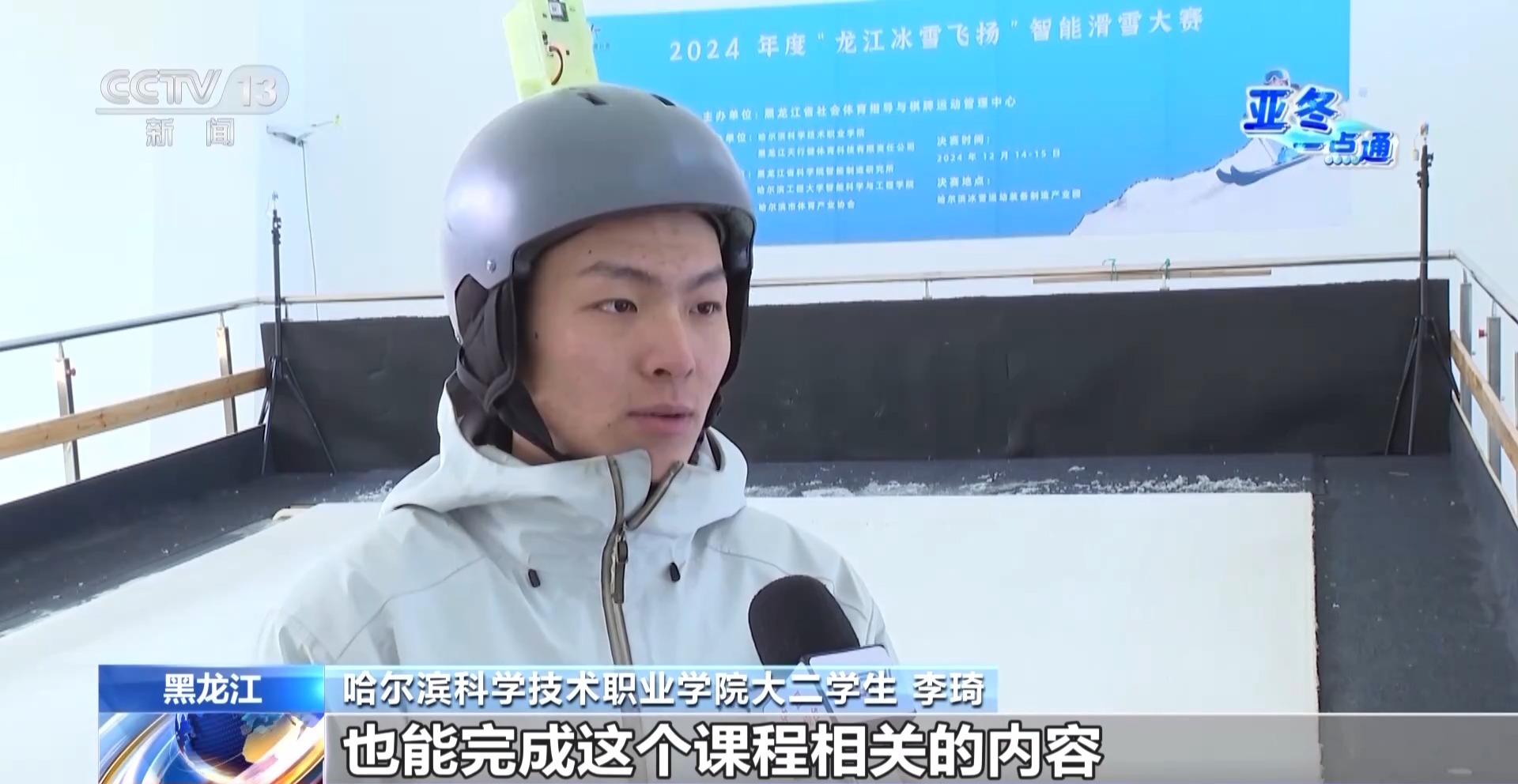 哈尔滨科学技术职业学院大二学生李琦:在这个模拟机上也能完成这个课程相关的内容。它容错率要比室外滑雪更低,因为它的动作要求更高一点,技术要求更加细致,在技术提高方面,它的帮助其实比在雪上训练帮助要大。