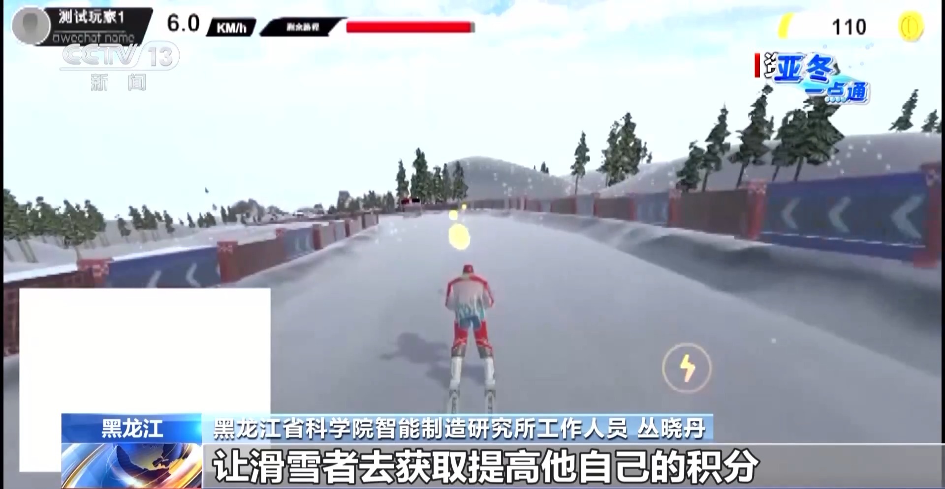 黑龙江省科学院智能制造研究所工作人员丛晓丹:我们也有设置一些金币和相应的奖励措施,让滑雪者去获取提高他自己的积分。同时建立云端服务器,把他们自己的成绩上传到云端。这样同一条雪道上,你可以和全国甚至全世界的雪友一起竞技。