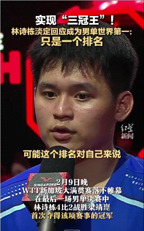 2月9日,WTT新加坡大满贯赛落下帷幕。在最后一场男单决赛中,林诗栋4比2战胜梁靖崑,首次夺得该项赛事的冠军。本届赛事,林诗栋实现混双、男双、男单的“三冠王”,凭借男单冠军积分,林诗栋单打世界排名升至第一。而林诗栋在赛后采访中淡定回应:只是一个排名。