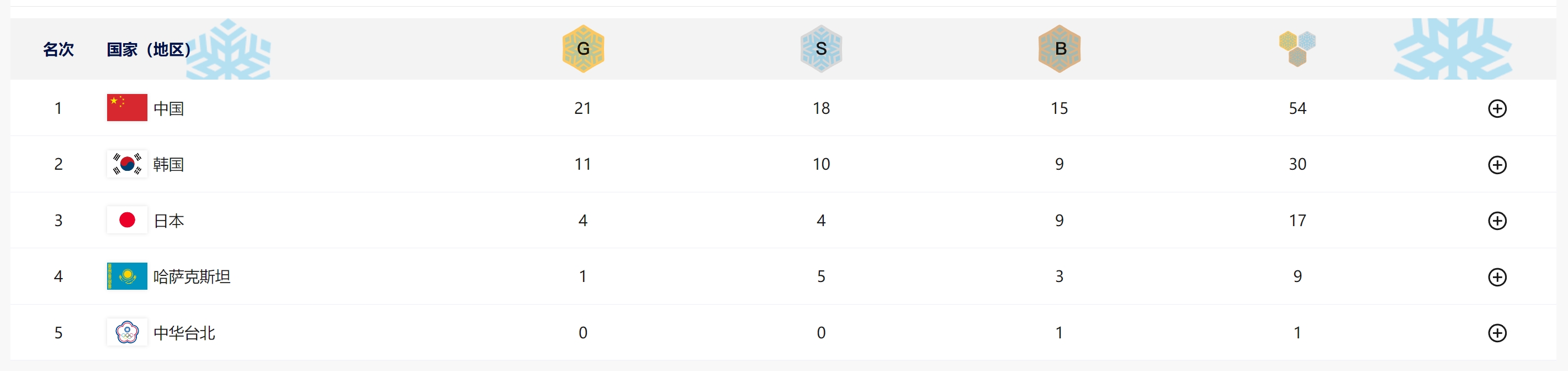 2月10日下午,哈尔滨亚冬会第三个金牌日的所有决赛结束。记者在官方竞赛系统看到,中国队已夺得54枚奖牌,其中金牌21枚、银牌18枚、铜牌15枚,位列金牌榜、奖牌榜首位,金牌数已超越中国队在2007年长春亚冬会上取得19枚金牌的最好成绩。