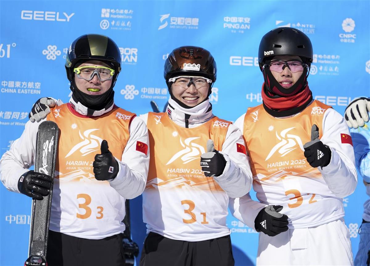 在雪上项目赛场,两位北京冬奥会冠军徐梦桃、齐广璞领衔,和小将李心鹏一同出战了自由式滑雪空中技巧混合团体项目决赛。自由式滑雪空中技巧是亚冬会最具观赏性的项目之一,混合团体比赛里团队成员的个人得分相加,总分最高的团队获胜。