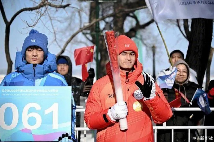 2月3日,火炬手盛李豪(右)在火炬传递中等待接力。新华社图