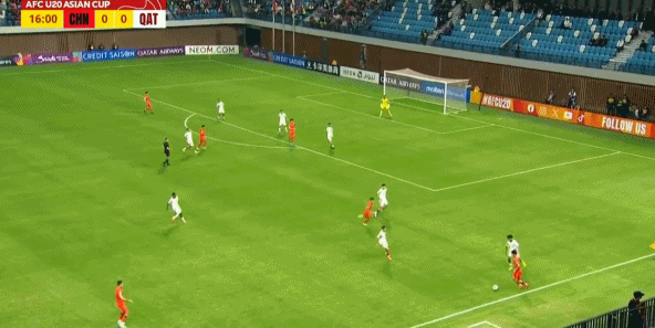 第21分钟,刘诚宇接队友直塞形成单刀,过掉门将打空门得分,中国队2-0领先卡塔尔队。