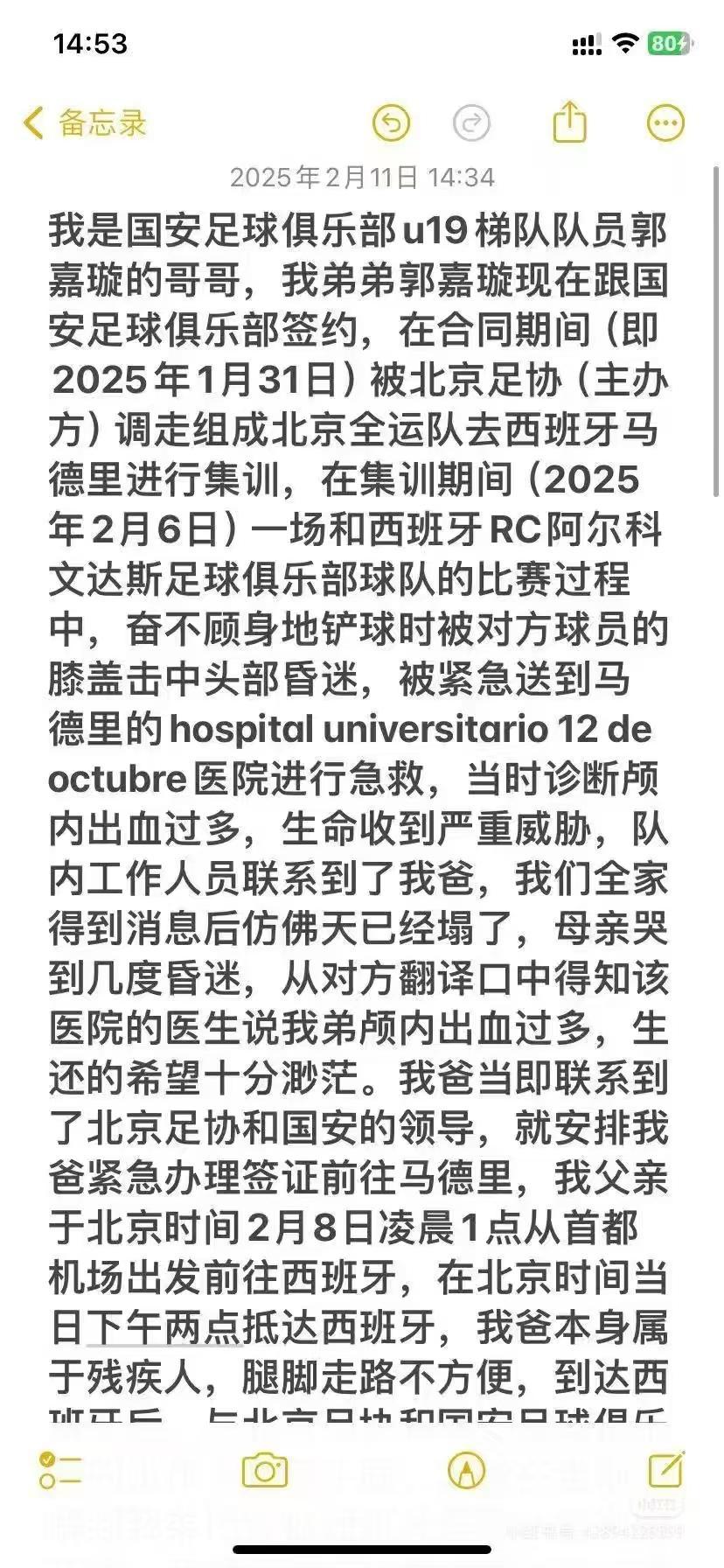 “我弟自从加入国安梯队就是队里的佼佼者,在每个队都是绝对的主力,外界给予的评价都很高,2023年还被拜仁慕尼黑选入他们的世界队,我们全家培养这孩子付出了多少心血,别人很难想象。我弟弟今年还不到19岁,前途一片光明,一直的目标就是让中国队踢进世界杯,就像我弟弟这么优秀的足球运动员,在比赛中出了这么严重的意外事故都得不到后续的保障,以后中国足球还有谁敢踢?”郭嘉璇哥哥称。
