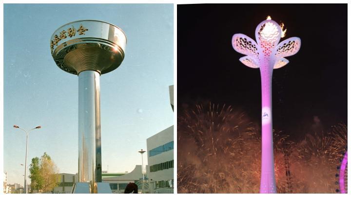 图为1996年亚冬会主火炬(左)和2025年亚冬会主火炬。新华社记者 周确、张涛 摄