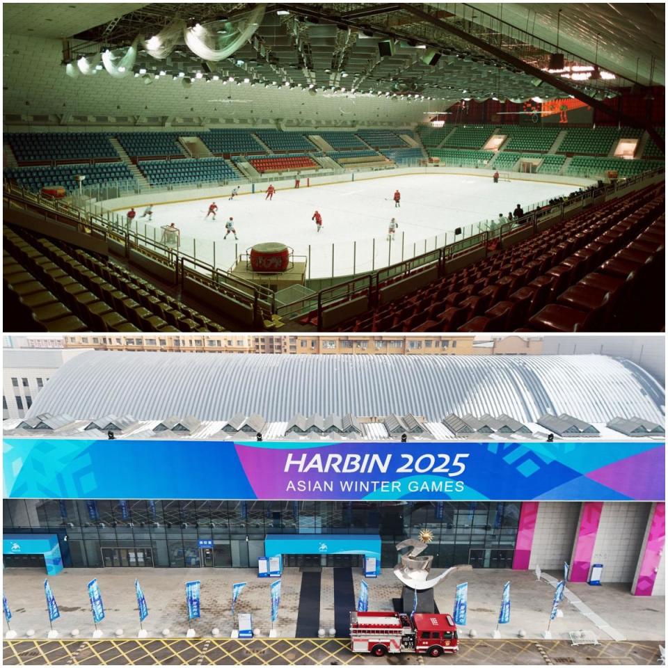图为1996年亚冬会的冰球馆(上)和2025年亚冬会的冰球馆。新华社记者周确、张涛摄