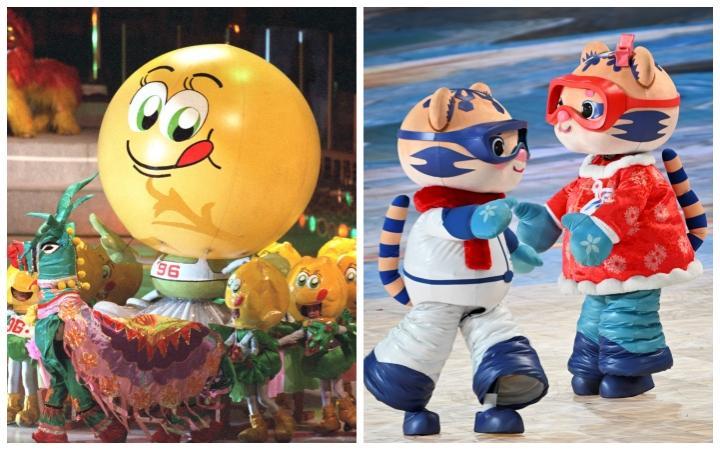 图为1996年亚冬会的吉祥物“豆豆”(左)和2025年亚冬会的吉祥物“滨滨”“妮妮”。新华社记者 罗更前、陈振海 摄
