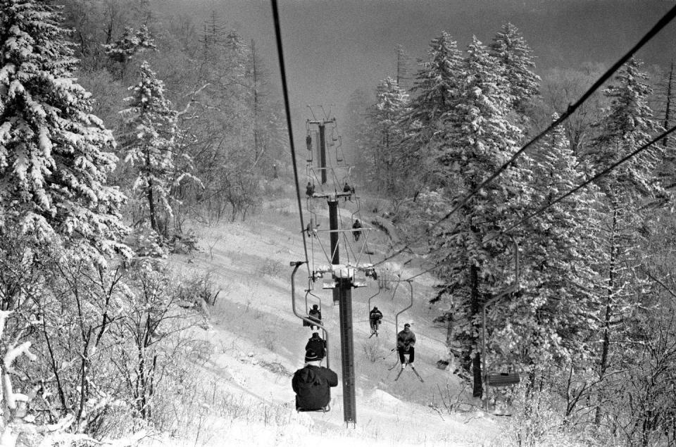 这是运动员们在亚布力滑雪场乘坐缆车登山。新华社记者 周确 摄 (1996年1月19日发)