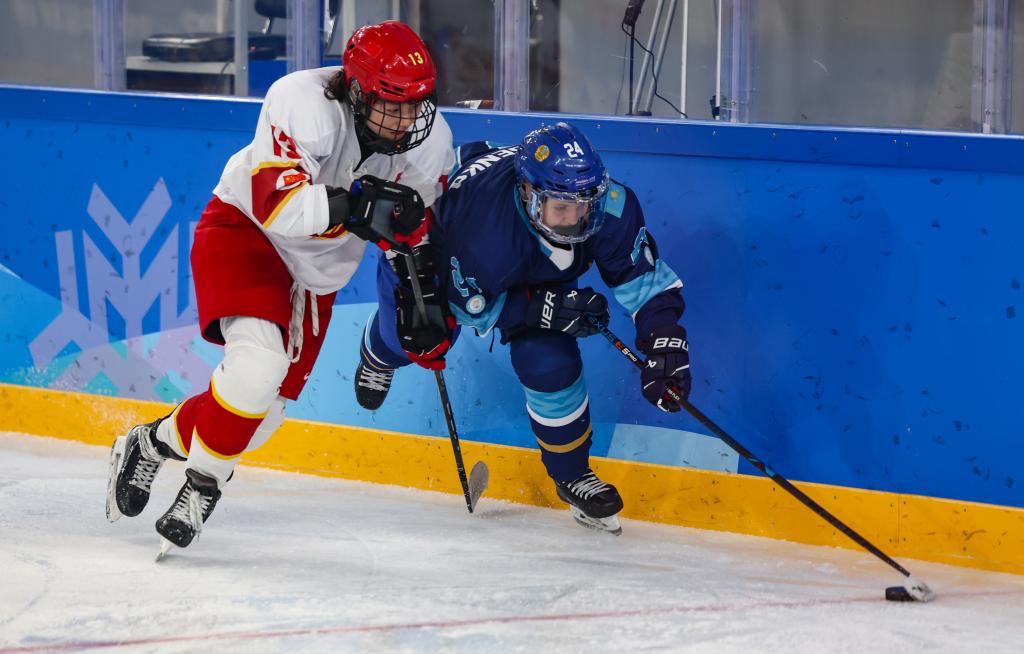 2月13日,中国队球员赵启男(左)和哈萨克斯坦队球员叶卡捷琳娜·库岑科在比赛中拼抢。当日,在哈尔滨体育学院大学生滑冰馆举行的第九届亚冬会女子冰球小组赛A组比赛中,中国队1:2不敌哈萨克斯坦队。新华社记者 王楷焱 摄
