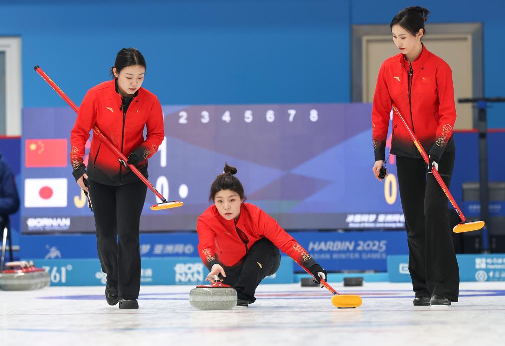2月13日,中国队选手在比赛中。当日,第九届亚冬会冰壶女子半决赛在哈尔滨举行。新华社记者 胡星宇 摄