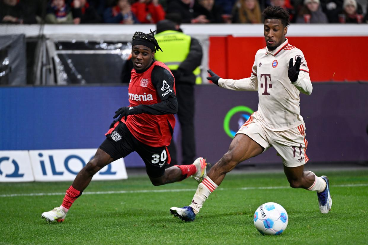 2月15日,勒沃库森队球员弗林蓬(左)与拜仁慕尼黑队球员科曼在比赛中拼抢。新华社发(乌尔里希·胡夫纳格尔 摄)