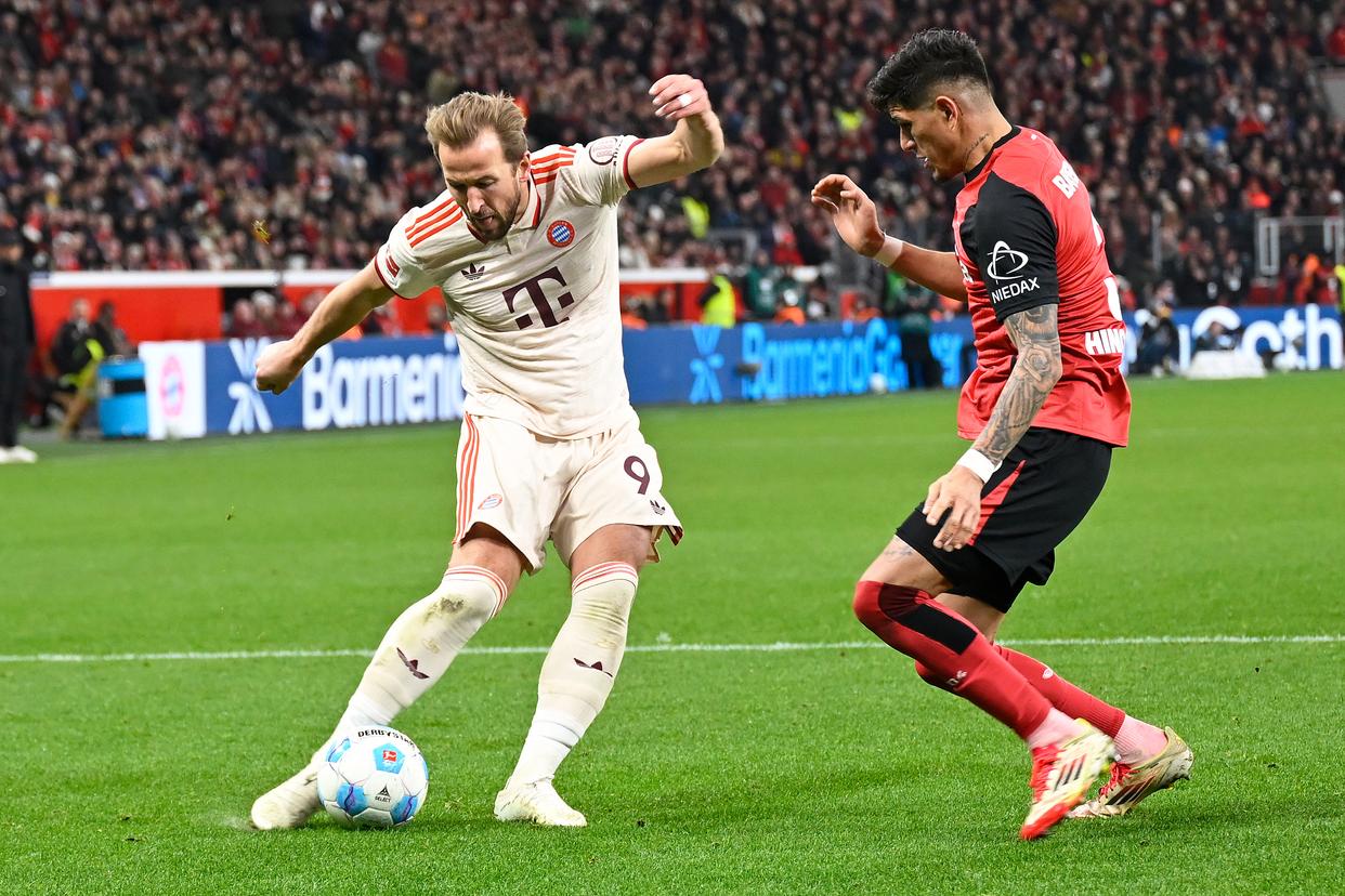 2月15日,拜仁慕尼黑队球员凯恩(左)在比赛中射门。新华社发(乌尔里希·胡夫纳格尔 摄)