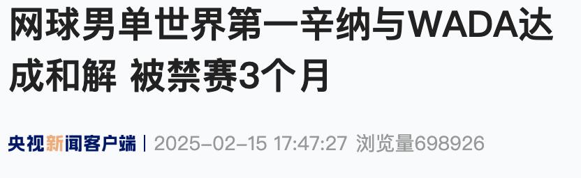 去年9月,世界反兴奋剂机构就该结果向国际体育仲裁法庭提出上诉。经过几个月的拉锯,最终辛纳与反兴奋剂机构达成和解,世界第一接受三个月的禁赛,世界反兴奋剂机构则撤销上诉。