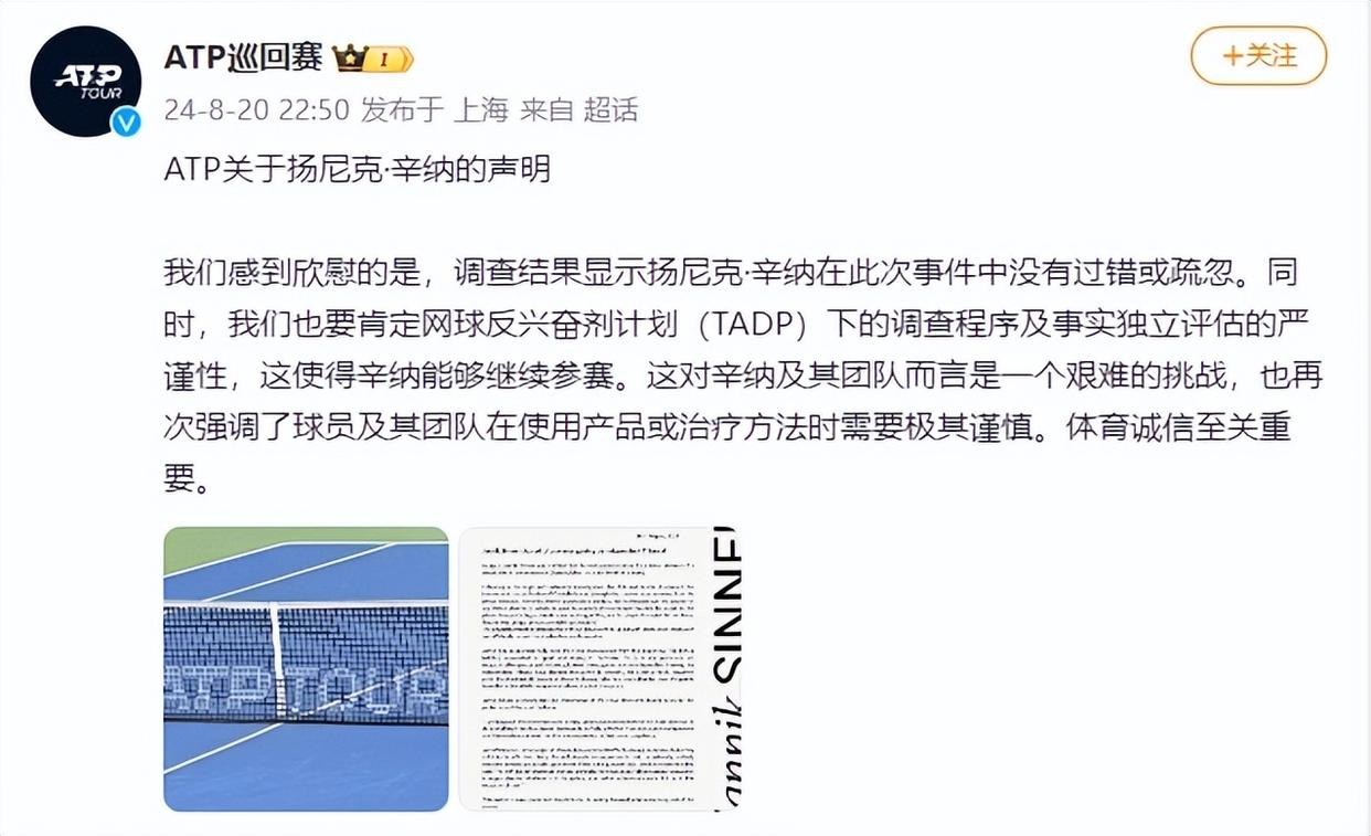 他们还确认,辛纳在去年药检风波后取得的,包括上海网球大师赛单打冠军在内的荣誉均不会被取消。这基本意味着即便遭遇禁赛,意大利人依然可以保住男子网坛世界第一的排名。