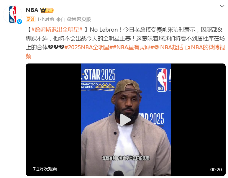 NBA官方随后也宣布了这一消息。这是詹姆斯生涯首次在入选全明星的情况下缺席比赛。