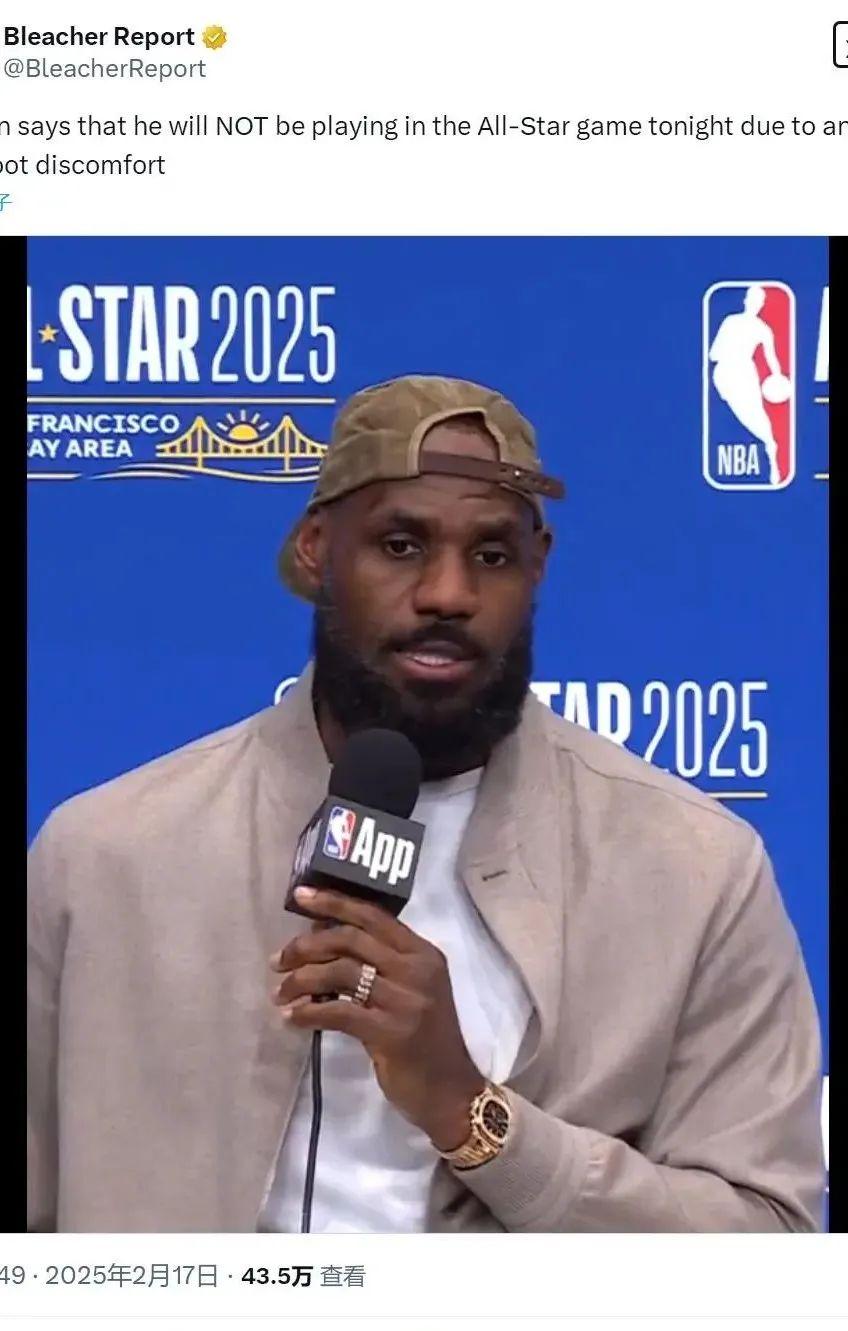 这是詹姆斯生涯首次在入选全明星的情况下退出比赛!詹姆斯说道:“常规赛只剩30场,湖人正努力争夺季后赛席位,尤其是在竞争激烈的西部,接下来非常重要。我退出全明星是维护身体状态,今晚我会回到洛杉矶,继续康复治疗。”