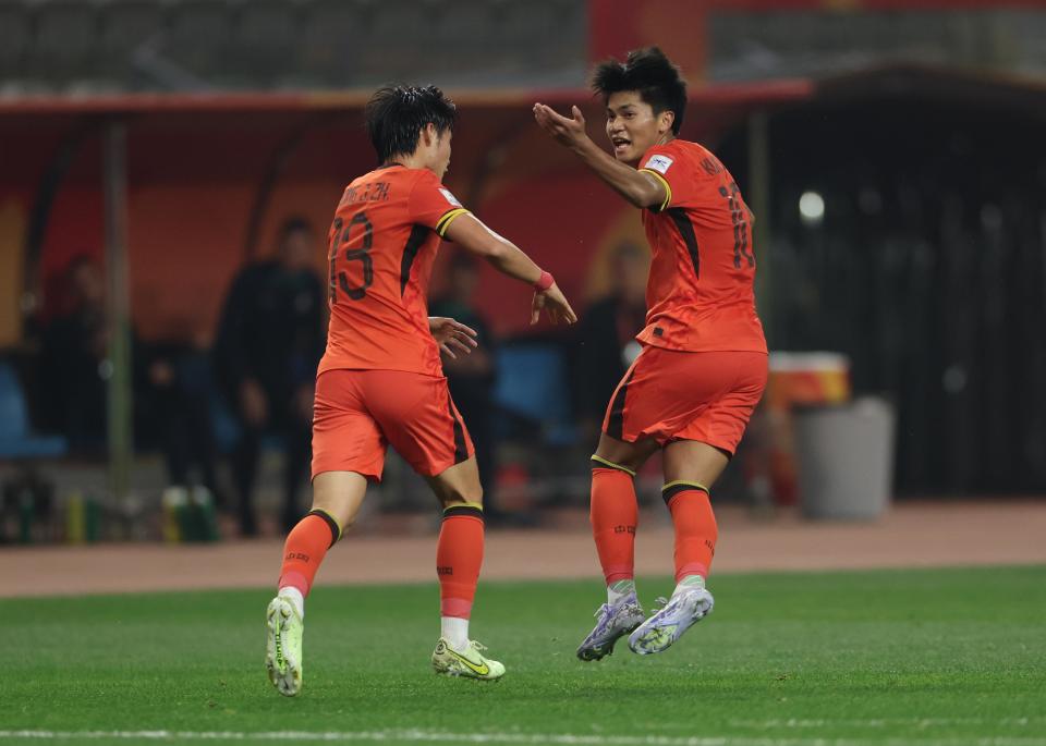 2月18日,中国队球员蒯纪闻(右)在比赛中庆祝进球。新华社记者 辛悦卫 摄