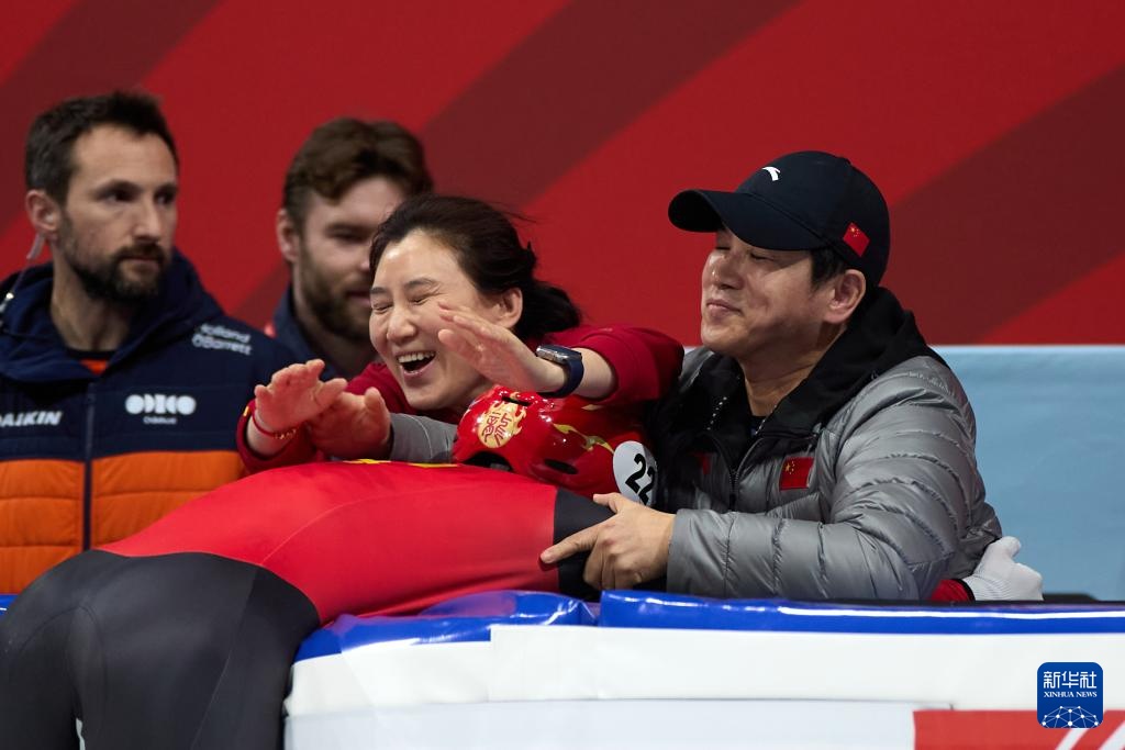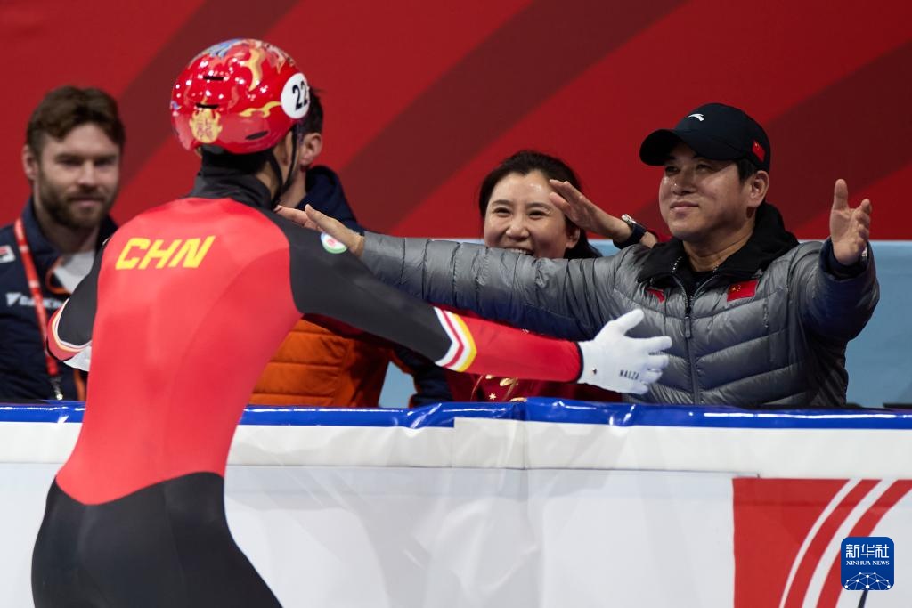 2月15日,中国选手孙龙(右二)在比赛后与教练拥抱庆祝。新华社记者 孟鼎博 摄