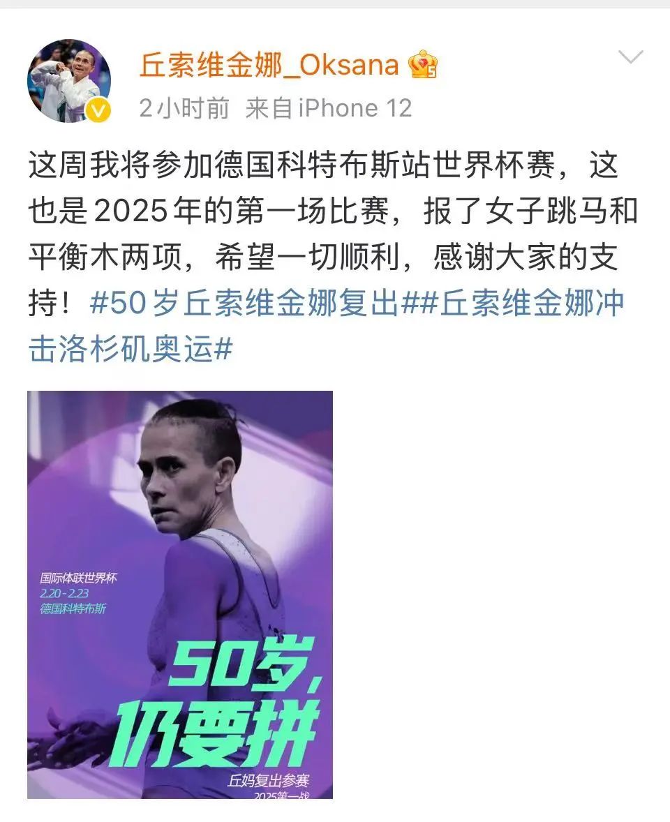即将在今年6月迎来50岁生日的丘索维金娜写道:“这周我将参加德国科特布斯站世界杯赛,这也是2025年的第一场比赛,报了女子跳马和平衡木两项,希望一切顺利,感谢大家的支持!”