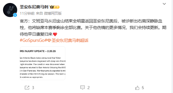 圣安东尼奥马刺队今日宣布,维克托-文班亚马被诊断出右肩深静脉血栓。这一情况是在文班亚马参加完旧金山全明星赛后返回圣安东尼奥时发现的。文班亚马预计将缺席2024-25赛季常规赛剩余比赛。球队将适时提供进一步更新。