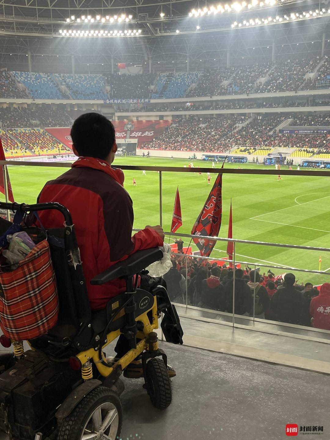 看台上的他,在比赛前,跟随倒计时一起倒数,比赛开始后,他激动地扶着栏杆从轮椅上站起,频频为蓉城队的进攻鼓掌,与全场4万球迷齐声高喊“雄起”。