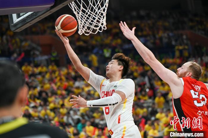 2月20日晚,在广东深圳举行的国际篮联2025男篮亚洲杯预选赛中,中国队100比58战胜日本队。图为中国队球员赵睿(左)在比赛中上篮。 中新社记者陈骥旻摄