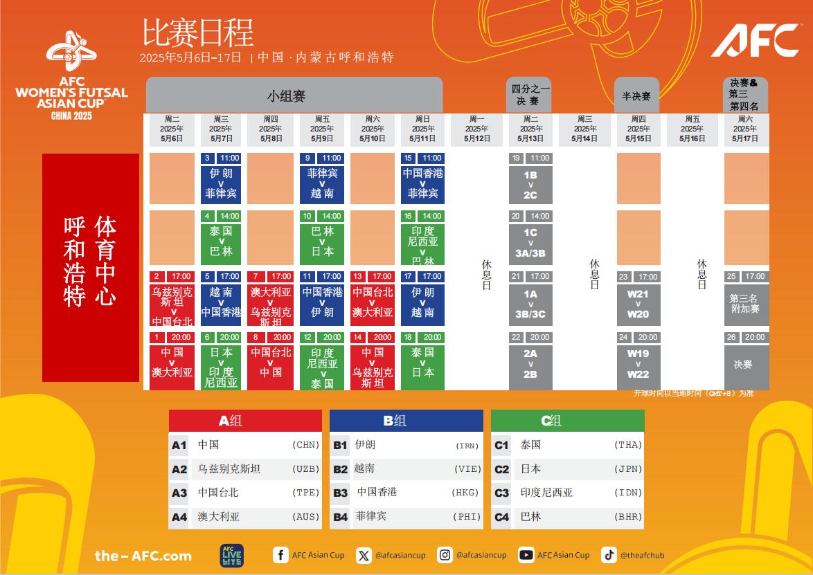 2025亚足联女子五人制足球亚洲杯决赛赛程公布