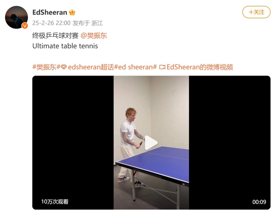 2月26日晚间,英国男歌手艾德·希兰(Ed Sheeran,昵称“黄老板”)在其社交账号发布一段与樊振东打乒乓球的视频,并配文“终极乒乓球对赛”。
