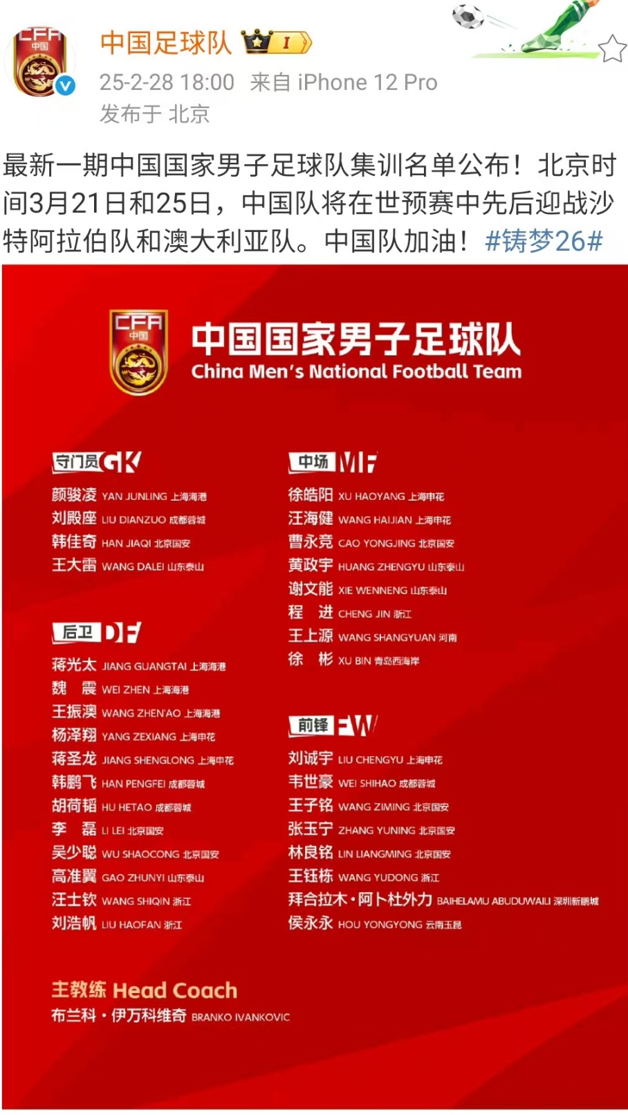 北京时间2月28日,为了备战18强赛与沙特和澳大利亚的第7和第8轮比赛,中国男足公布了最新一期国家队集训名单。侯永永在列,国青队的王钰栋、刘诚宇入选。