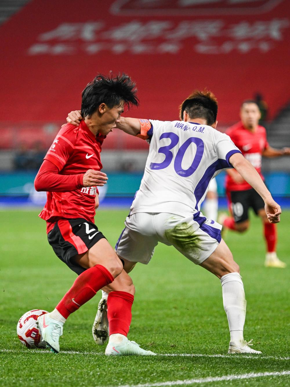 3月2日,成都蓉城队球员胡荷韬(左)与天津津门虎队球员王秋明在比赛中拼抢。新华社记者 王曦 摄