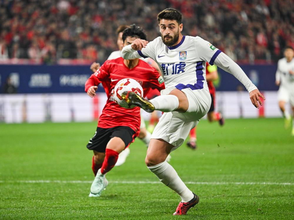 3月2日,天津津门虎队球员哈达斯(右)在比赛中拼抢。新华社记者 王曦 摄
