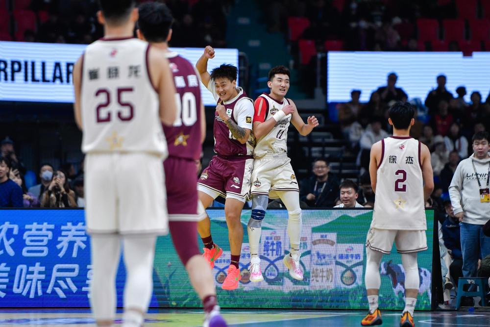 3月2日,北区明星队球员赵睿(左)与南区明星队球员孙铭徽在比赛后庆祝。新华社记者 许畅 摄