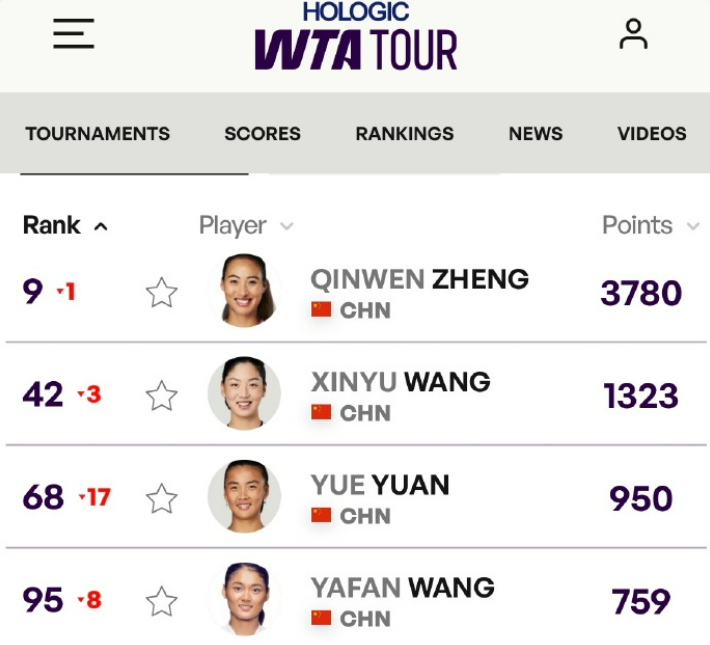 此外,王欣瑜世界排名下降3名至第42位,袁悦排名第68位。