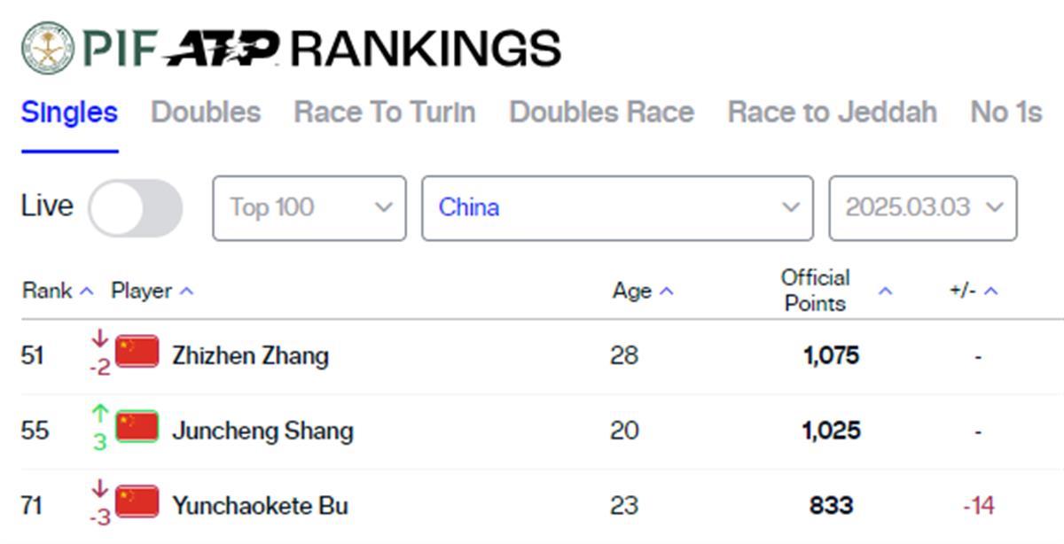 中国金花方面,目前在Top50区间的,仍是郑钦文和王欣瑜。去年在印第安维尔斯打入八强的袁悦,目前排在第68位,她必须尽快调整好状态,否则将面临滑至百名附近的处境。