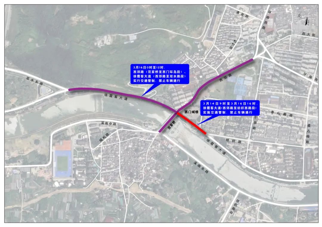 (二)3月16日0时至12时,西郊路(范家桥至西门环岛段)、徐霞客大道(西郊路至双水路段)将实行交通管制,禁止车辆通行。