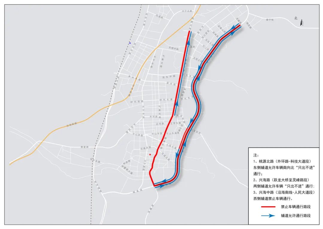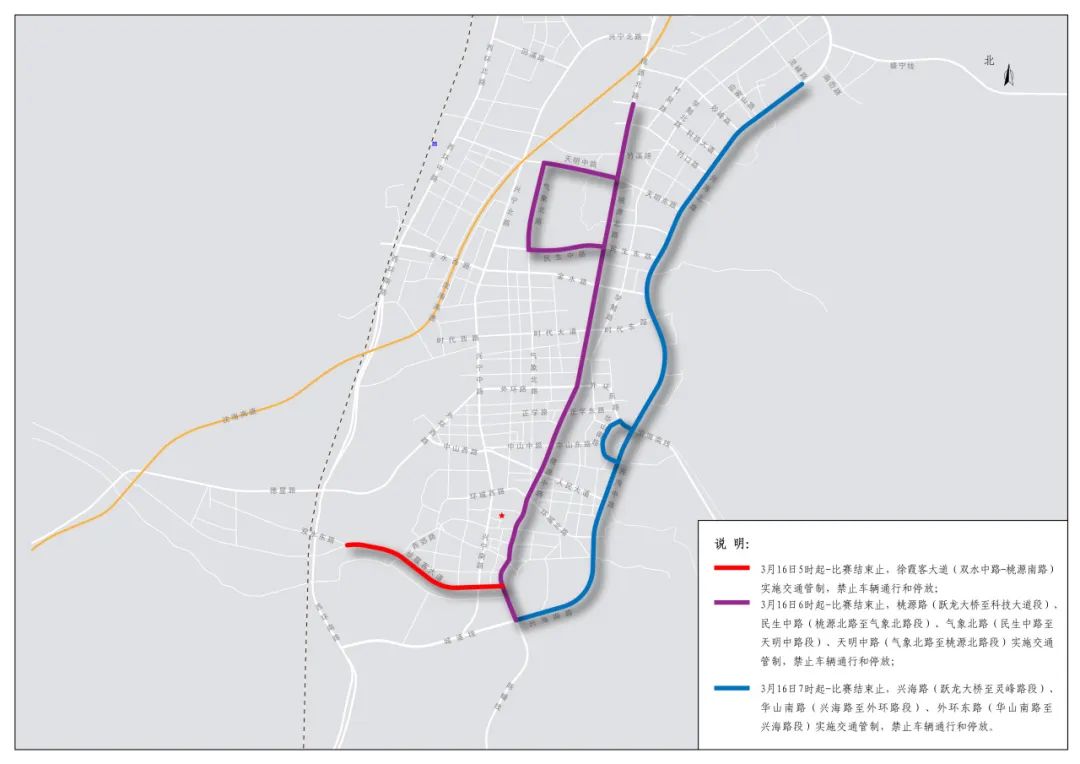 (四)赛事当天管控区域允许通行路段:因桃源路、兴海路封道,为方便群众出行,桃源北路(外环路至科技大道段)东侧辅道允许车辆南向北“只出不进”通行,兴海路(跃龙大桥至灵峰路段)两侧辅道允许车辆“只出不进”通行。