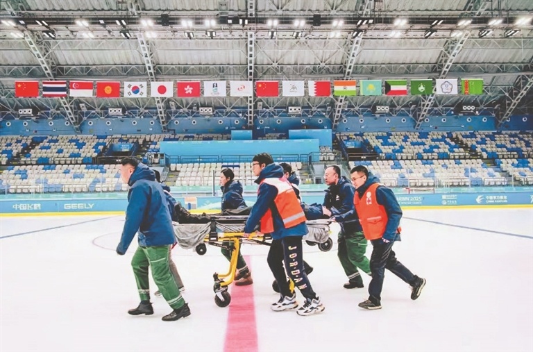 作为本届亚冬会的分赛场之一,哈尔滨体育学院大学生滑冰馆承担了27场冰球比赛及62场训练保障任务,4名浇冰车驾驶员日均工作18个小时。该馆管理中心主任许燕明介绍,为保障亚冬赛事顺利进行,他们创新采用冰面logo叠加方式,降低冰漆用量与人工成本。面对冰场高强度使用情况,团队综合调整清冰给水量、冰面修整流程、控制场馆温湿度等措施,经过多次测试总结出一套开窗降温保冰面、观众体感不受影响的统筹法,用创新思维大胆破解难题。