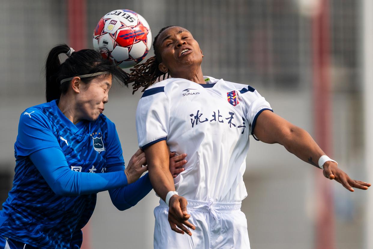 3月8日,辽宁沈阳沈北禾丰队球员奇农耶雷姆·马科林斯(右)和武汉车谷江大队球员赵雨欣在比赛中争顶。新华社记者 伍志尊 摄
