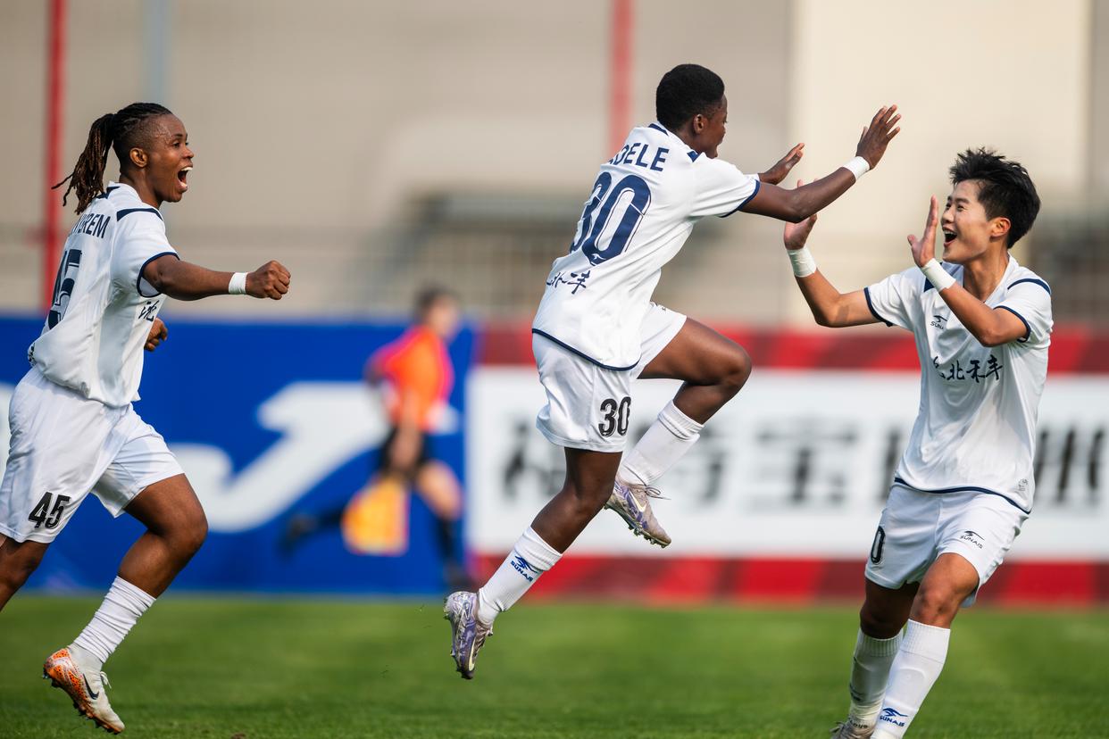 3月8日,辽宁沈阳沈北禾丰队球员内奥米·阿黛尔·卡布雷(右一)在进球后和队友庆祝。新华社记者 伍志尊 摄