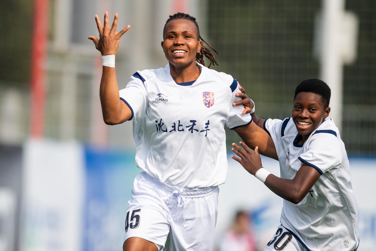 3月8日,辽宁沈阳沈北禾丰队球员奇农耶雷姆·马科林斯(左)在进球后和队友内奥米·阿黛尔·卡布雷庆祝。新华社记者 伍志尊 摄