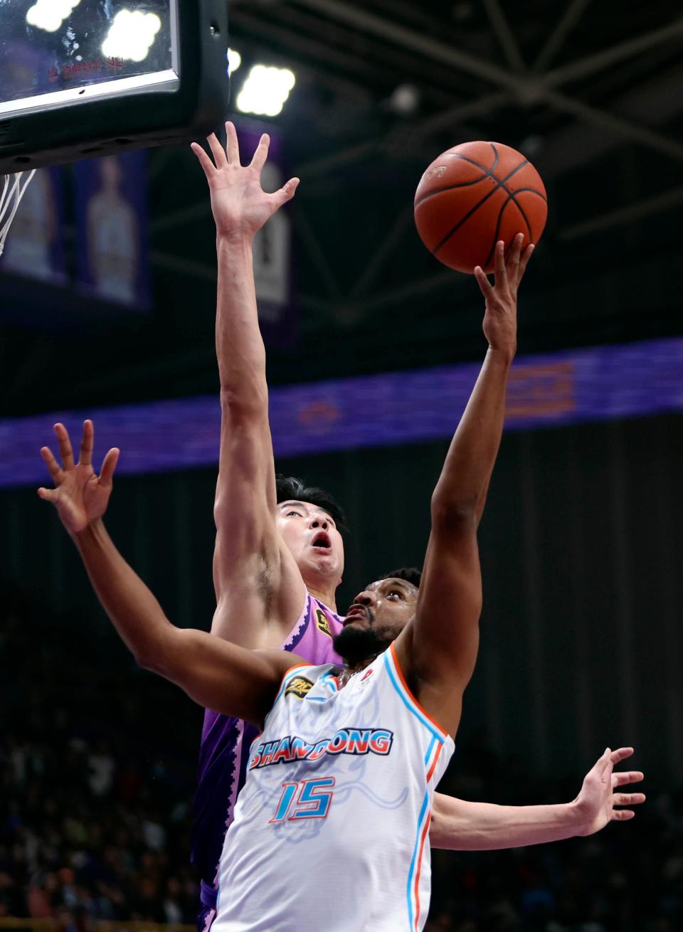 3月8日,山东高速队球员盖利(左)在比赛中上篮。新华社记者 雒圆 摄