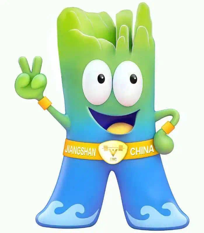 吉祥物“山山”由江郎山、须江等元素组成,具有鲜明的江山地域特征和辨识度。采用大眼眶、小眼珠、大嘴巴、细手粗腿造型,可爱呆萌,亲切活泼,具有很强的亲和力。“山山”腰扎皮带,手戴护腕,具有十分鲜明的举重运动员特征。
